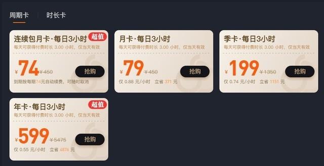 价格方面,顺网云电脑分为时长卡和周期卡,20小时时长卡59元,周期卡年卡599元,每天可玩3小时。对比腾讯Start云游戏价格不算便宜。