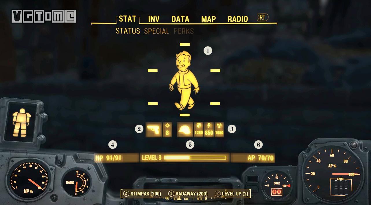 3.此处显示防御力,表示穿着盔甲后的防御能力。动力装甲能提供更强大的防御能力。如果你的盔甲拥有防辐射等属性,也会显示于此。