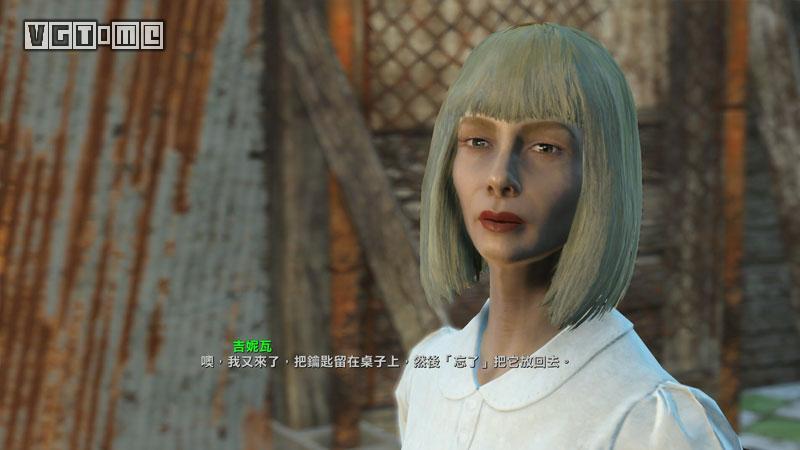 在自家门前跟嘎抓对话,选择黄色的选项这个机器人会情绪崩溃,非常感人。它会给你你的老公/老婆留下的全像影带,可以直接用Pip-Boy收听,让你更加想找到儿子以及报仇。跟着嘎抓游历两个房子,干掉一些昆虫后(如果你走得慢,嘎抓会独力全部干掉)。向康德进发,在红火箭维修站会遇到忠实伙伴狗肉。