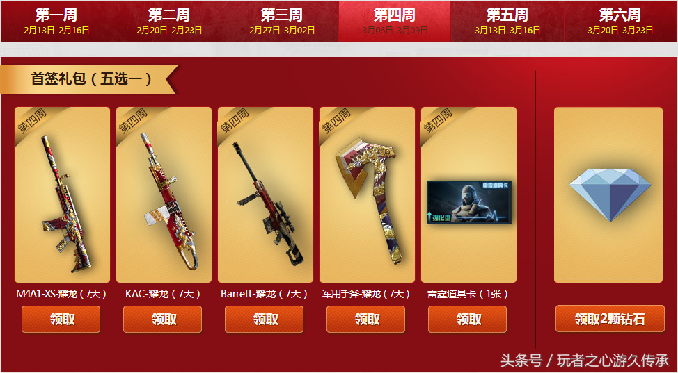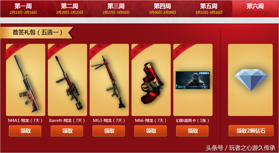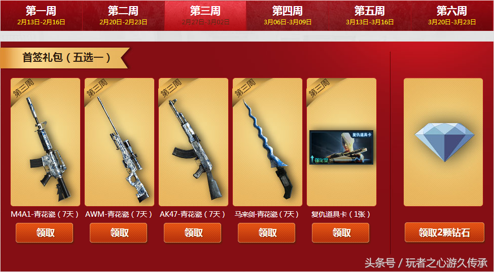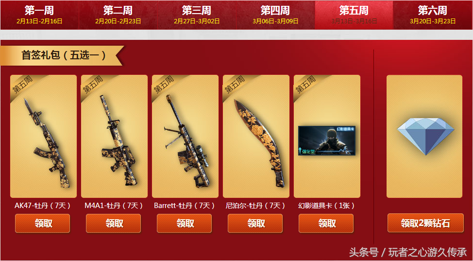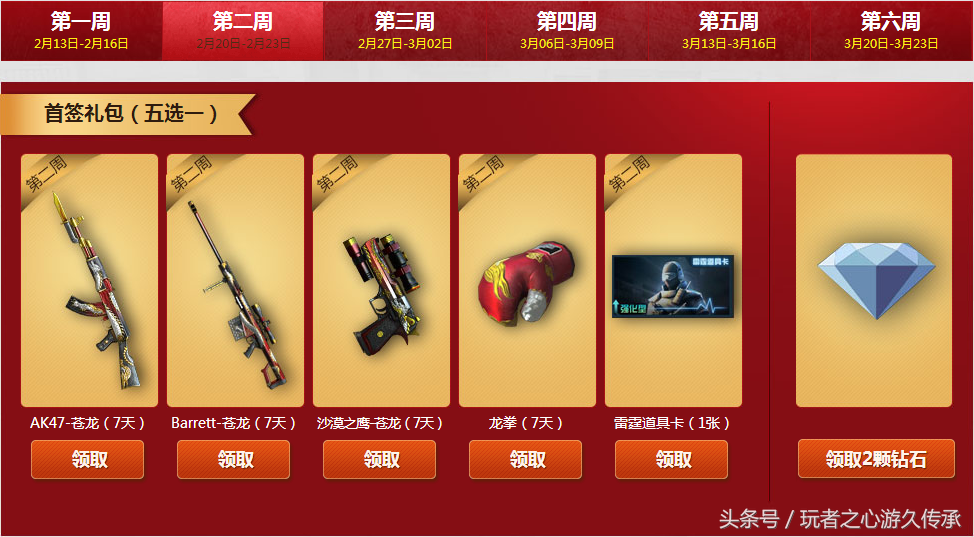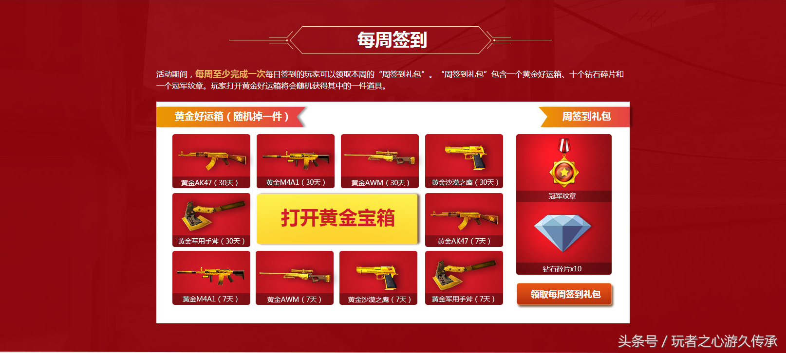 每周签到一次可以领取周签到礼包,可抽取黄金武器一件并领取冠军纹章和大量钻石碎片