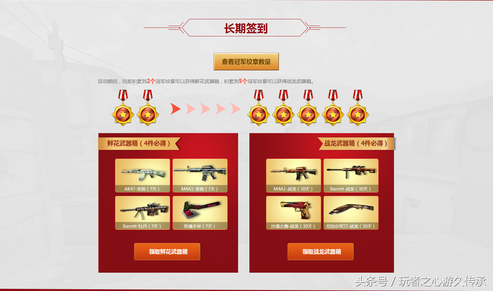 累计冠军纹章可以兑换鲜花武器箱以及战龙武器箱