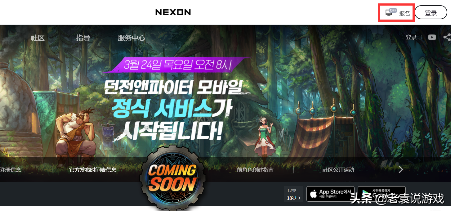 2、进入到nexon网站,在网站的主页里面找到下图中的地下城与勇士移动预登记,点击“立即预注册”即可进入到DNF韩服官网。