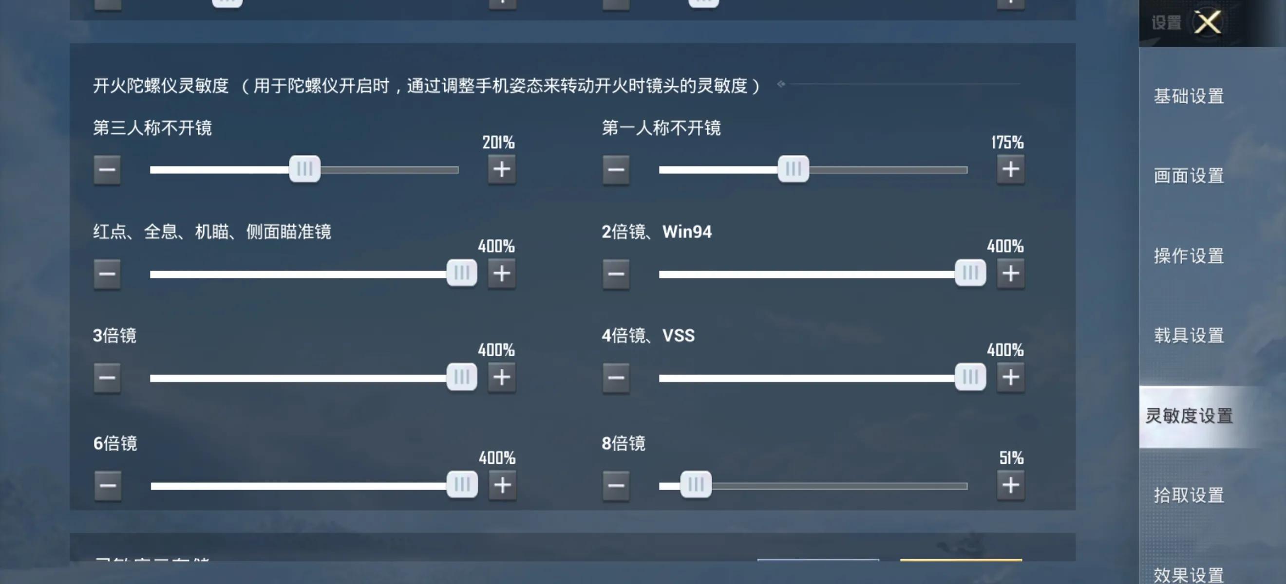第三步就是使用陀螺仪,这里有推荐使用全陀螺仪,因为在实战中敌人的走位是非常大的,这使得跟枪与压枪难度更大,陀螺仪能根据摇感调节屏幕,配合手搓枪口转动更灵活,枪口抖动时能更好的压住枪口,使得子弹集中在目标身上。陀螺仪灵敏度最高设置稍微高点,这样转动屏幕幅度会更大,适合跟枪与快速反应,下面是我推荐陀螺仪灵敏度。