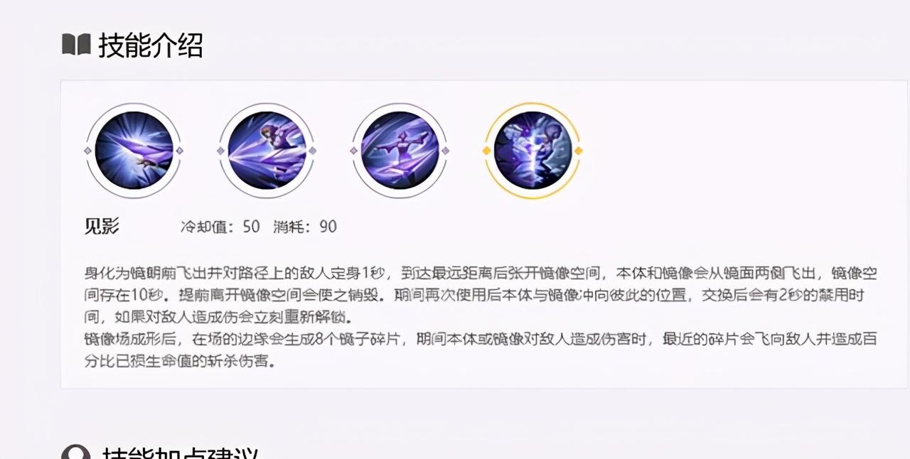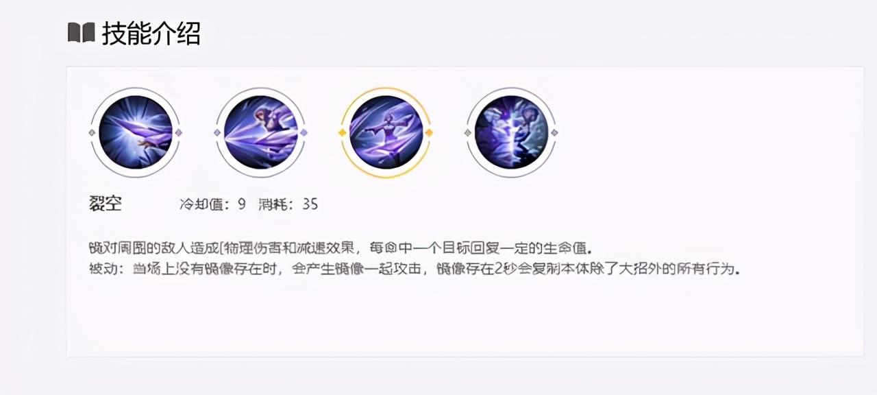 三技能:镜的三技能见影,向前冲刺,对敌人造成1秒钟定身敌人是动不了的在此期间本体和镜像会换位置。造成许多玩家的困扰,这只有张时间的实战才能慢慢的熟悉她。