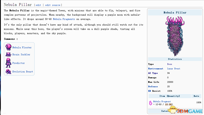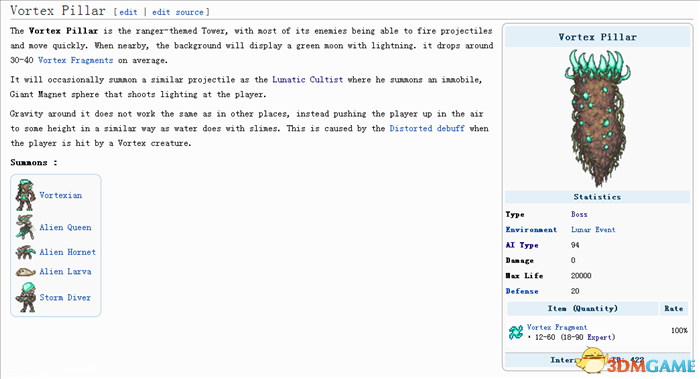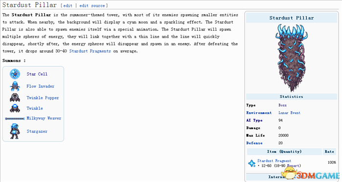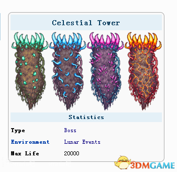 天界塔。是出现在月球事件中的4个boss,当狂信教徒被击败时它们会在4个地图的预定地(2个在西、2个在东)生成。他们分别是:Vortex pillar星旋之柱(对应射手)、Stardust pillar星尘之柱(对应召唤师)、Nebula pillar星云之柱(对应法爷)、Solar pillar日曜之柱(对应强大的战士)