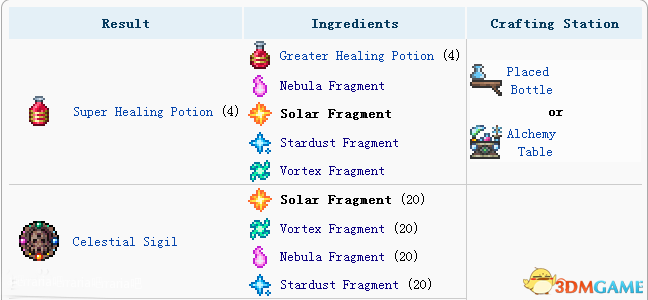 第一个是超级治疗药水(回复原版最高血量的1/3,好吧也就是200),在奇葩药水架(地牢有捡)或者玻璃瓶处合成