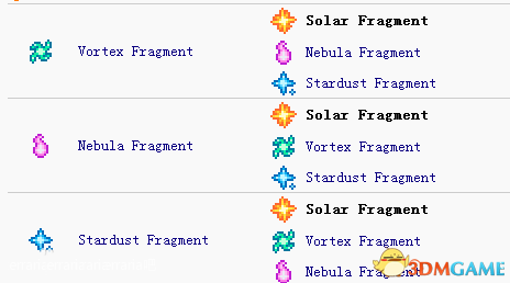 泰拉瑞亚四柱掉落物:所有柱子都会在死亡后掉落一些类似魂魄的碎片,星云柱掉星云碎片,日曜柱掉日曜碎片,星旋柱掉星旋碎片,以及星尘柱掉星尘碎片。