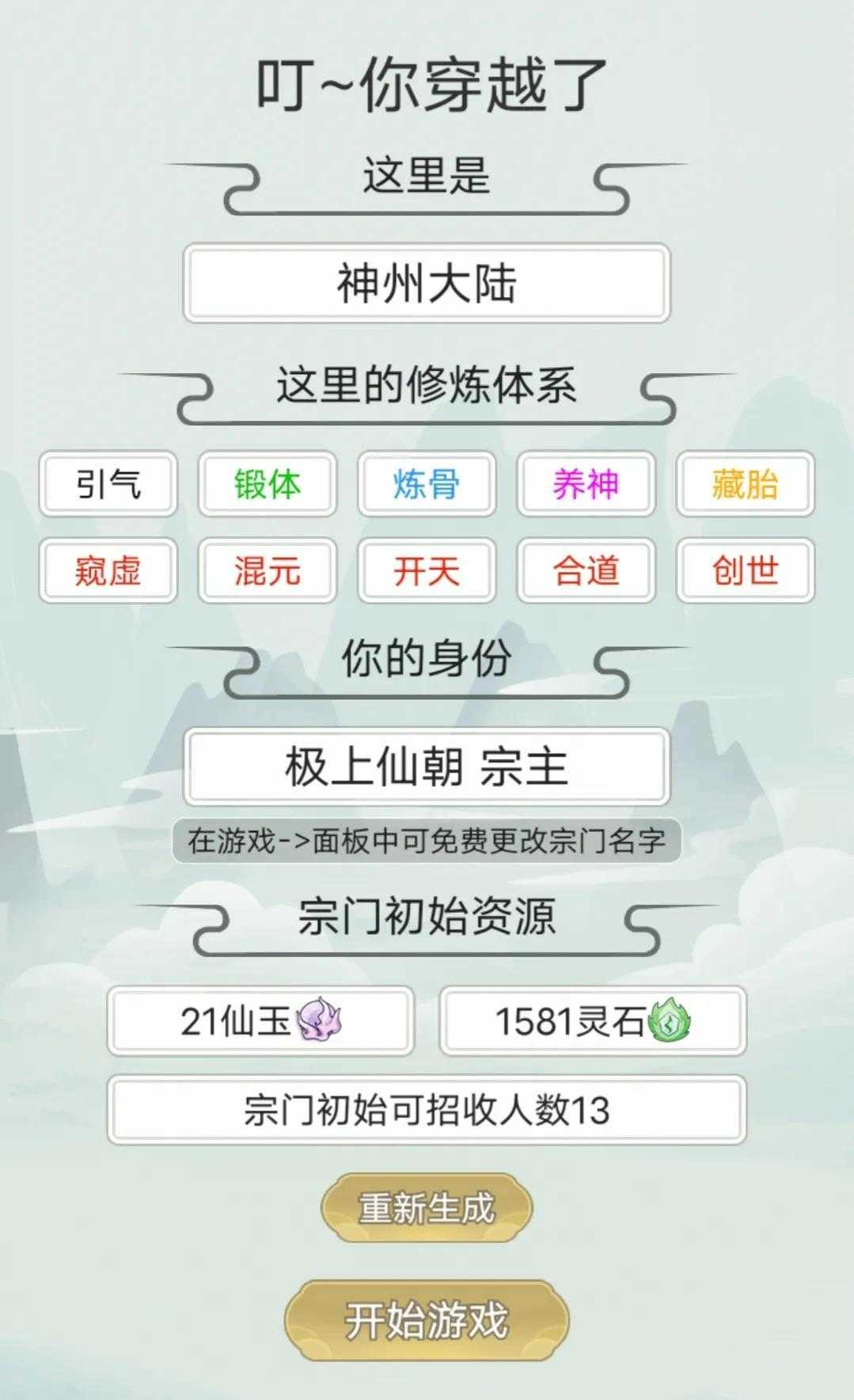 首先进入游戏便会有一个大陆和修炼体系以及宗门初始资源的选择。