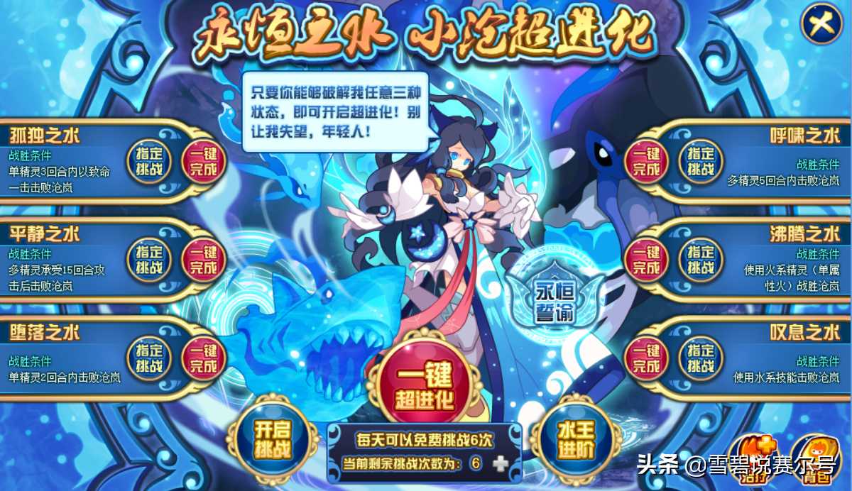 多精灵5回合击败,最简单的条件,但是根本抽不到;单精灵用火系精灵击败,2命,基本就是猩猩完全体带个瞬杀珠子或瞬杀特性慢慢磨死;5命,要求水系技能击败,最阴间的特性,目前的打法也只是用圣雷,黑胖拼脸杀一命是一命,表姐接强攻精灵硬打。