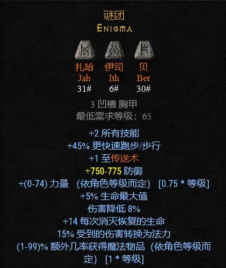 符文之语谜团是除法师之外众多角色必做的,又被称作TP甲,+1的传送术使得角色更加灵活。+2所有技能、加大量获得魔法物品几率(MF)、加大量力量、加防御这些属性都非常好用,但一个30#贝和一个31#乔(或者叫扎哈)就注定了不便宜。
