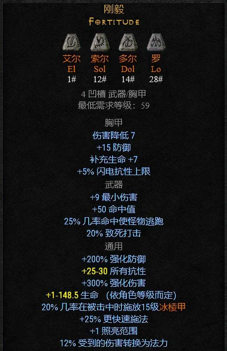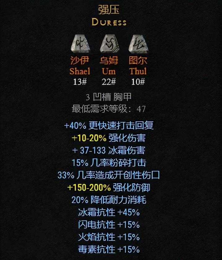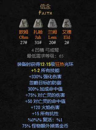 符文之语无限装备时获得12级审判(定罪)光环,减少怪物抗性,加上减少敌人大量电抗,是很多元素伤害角色玩法佣兵的不二选择。40%的粉碎打击也对BOSS伤害很高。但两个30#贝让很多玩家望而兴叹。