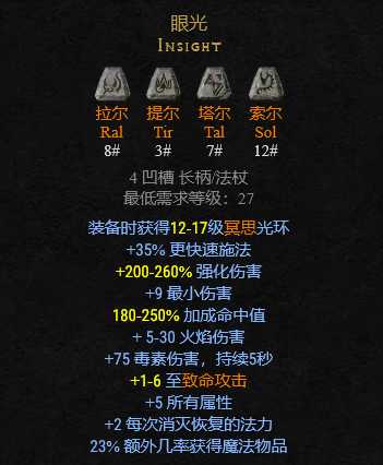 符文之语精神算是暗黑2中性价比最高的符文之语了,既可以做精神剑,也可以做成精神盾,加2技能等级、快速施法(FCR)、法力、防御、抗性都是法系角色所需要的。最大号符文11#安姆在普通难度就能获得,甚至可以拿着它从普通难度直至通关地狱。