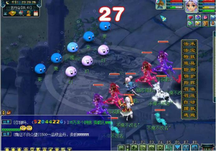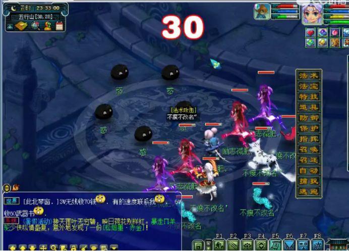 第2场战斗开始了。前排的3个白色泡泡是FC,后排的主怪会3封,其他小怪为狮驼岭。