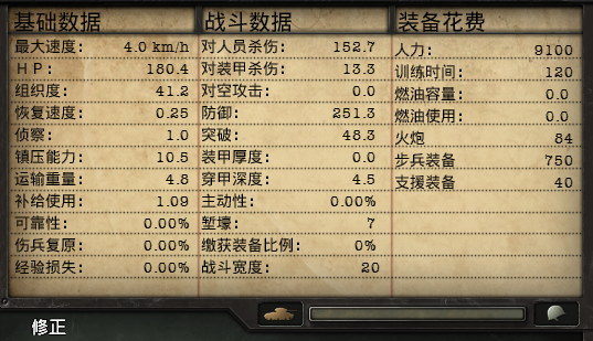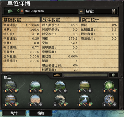 上图是一张典型的陆军单位详情图,上方密密麻麻的数字就是该单位现在的属性,下方则是在各种地形上的属性修正。