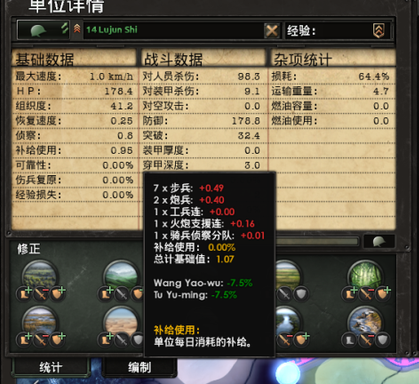 补给使用:非常重要的属性,可以理解为单位正常作战时需要的后勤补给数量,或者简单理解为弹药和粮食都行。