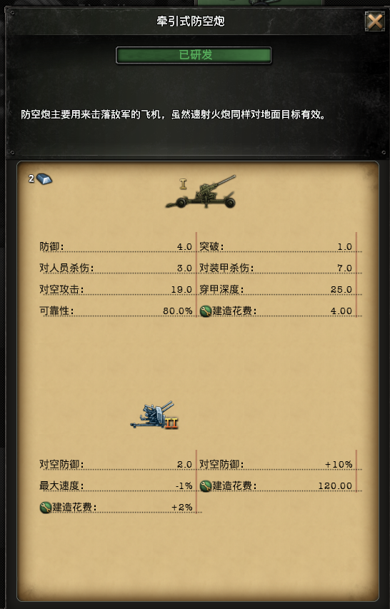 对空攻击:对空中单位的攻击力。由防空炮提供。在游戏中对空中单位造成伤害的装备有防空炮以及战斗机,1门初级防空炮对空攻击力约等于2架初级战斗机。所以工业能力不强,没有能力造战斗机时,可以选择给单位加装防空炮,以削弱敌方的空中力量。