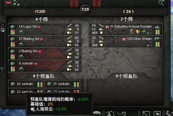 一旦我方某一支正在战斗的师后退时,预备队就会有几率填补上去,此项判定每小时进行一次,如果我方主战场所有师都败退了,但预备队还没有支援,那么此战结束,我方失败。
