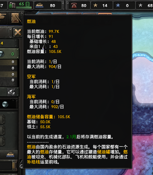 燃油使用:单位进行活动时消耗的燃油数量,对于摩托化部队来说,此数值越低越好,后勤连可以提供减免。燃油,自从摩托化部队诞生以来,一直都是很重要的资源,一般只能从石油中获取。