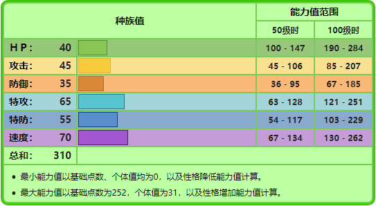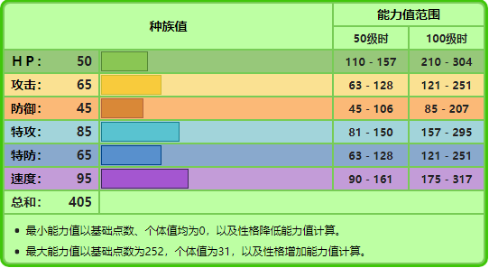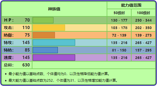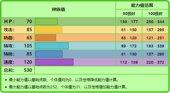 注:技能参照第七世代游戏技能表。技能里粗体字的招式为具有属性一致加成效果的招式。