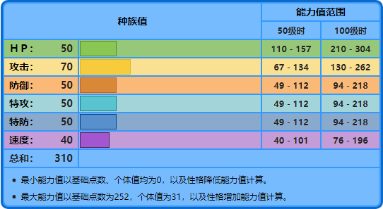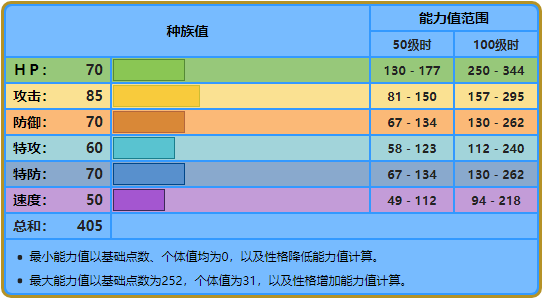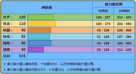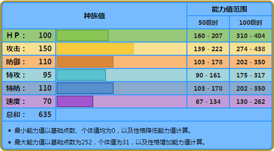 注:技能参照第七世代游戏技能表。技能里粗体字的招式为具有属性一致加成效果的招式。