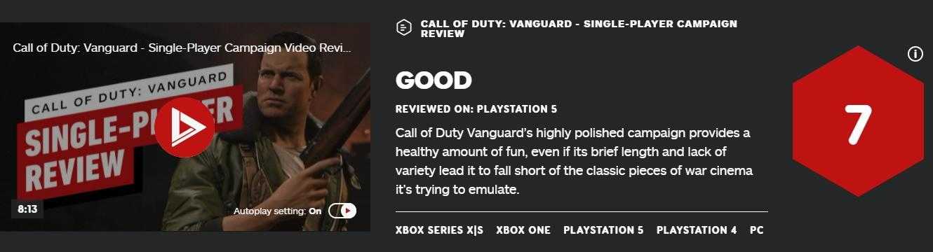 《使命召唤18:先锋》将于11月5日发售,登陆PC/PS4/PS5/X1/XSS/XSX平台。外媒IGN为《使命召唤18》单人战役进行了评测,并给出7分好评。IGN认为《使命召唤18》单人战役为玩家带来了许多乐趣,但流程较短,缺乏多样性。