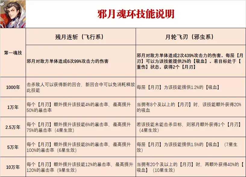 2222 +【狂怒】:这套魂环配置是邪月在打伤害长图中的标准配置,利用1技能【月轮飞刃】在攻击【重伤】敌人时可以额外获得【月刃】的效果,搭配2技能【弦月乱舞】最高26个【月刃】数量的效果,可以最快让邪月在4个回合内达到24层【月刃】,从而满足4技能【狂刃屠戮】的爆发门槛