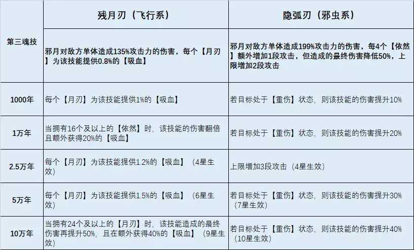 接下来我们看到的是邪月的普攻第3魂环技能,这2个技能我们只需注意【残月刃】是聚焦于【吸血】能力的普攻技能 ,而【隐弧刃】则是一个聚焦于多段攻击和【重伤】增伤能力的普攻技能,考虑到邪月佩戴的【蝶后】魂骨套装中已经有了【吸血】的特点,因此我们也一般会选择【隐弧刃】来作为邪月的普攻技能。
