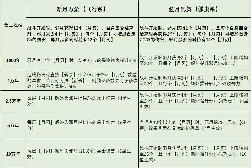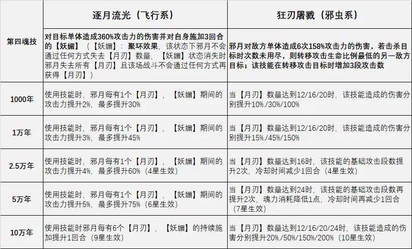 最后我们看到的是邪月的2个第4魂环技能,考虑到邪月不管是在短图、PVP还是长图中其实都是需要极致的爆发,短图和PVP需要的是战斗前2回合(最重要是第1回合)的极致爆发,而长图则是需要在【月刃】达到24个之后的极致爆发,因此【逐月流光】技能的特点和邪月的爆发特性也并不是非常匹配,相反【狂刃屠戮】技能不管是在短图、PVP,还是长图打伤害里又有着不俗的爆发能力,因此我们在邪月的第4魂环技能选择上,普遍都会选择【狂刃屠戮】作为邪月的爆发技能。