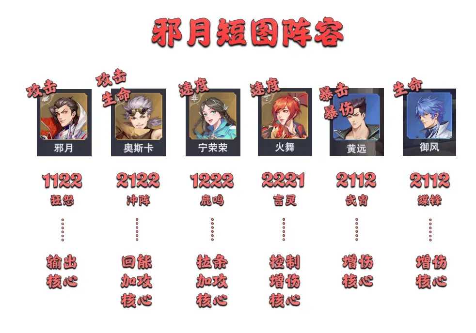 总之邪月打短图就是一个字:秒,如果秒不掉的话邪月的攻击也会呈现断崖式的下滑......基本到第3回合后邪月就没有什么输出了,所以秒就是这个阵容的真谛,当然大家在理解了短图阵容后也可以根据自身的习惯和玩法来进行阵容调配。