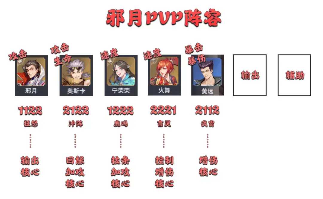 宁荣荣:荣荣在这个阵容中的效果一是拉条保证,这样才能让邪月在敌人行动之前进行攻击,有条件就用【七宝之敏】,拉条效果不够的话就用【七宝之御】;其次荣荣的2技能【玲珑】的【分心控制】效果也可以有效的保障邪月在战斗初期的伤害