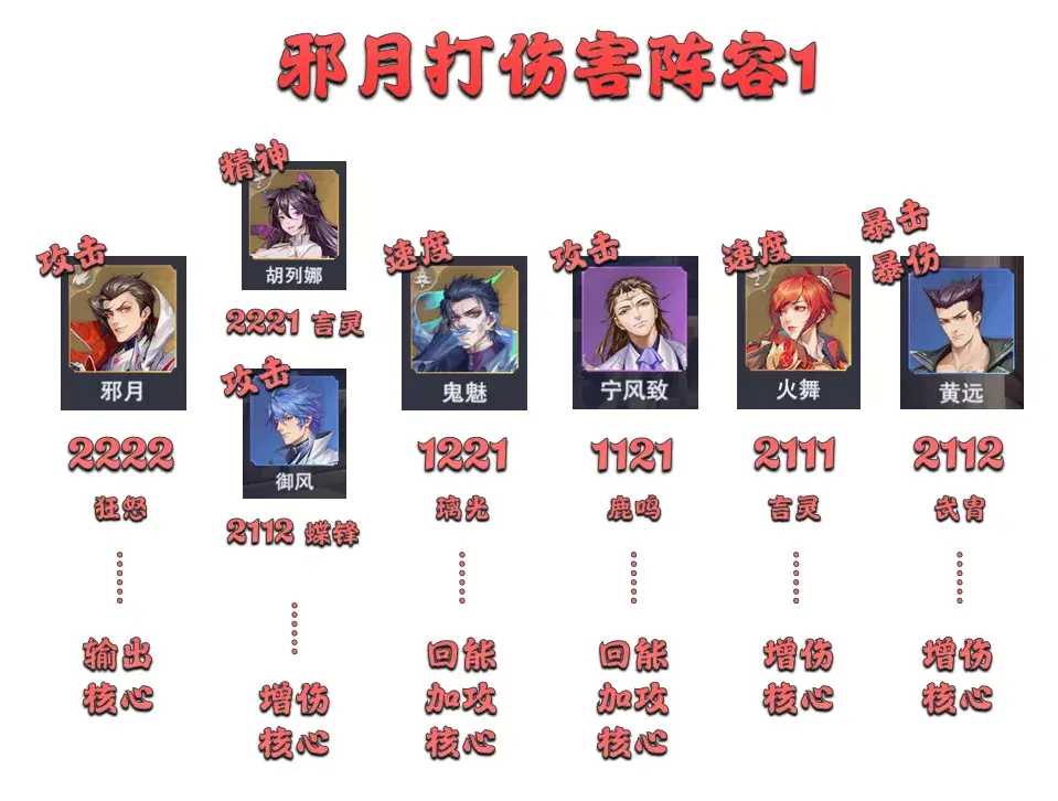 接着我们再来看看邪月在不同战斗魂环下的队伍搭配推荐: