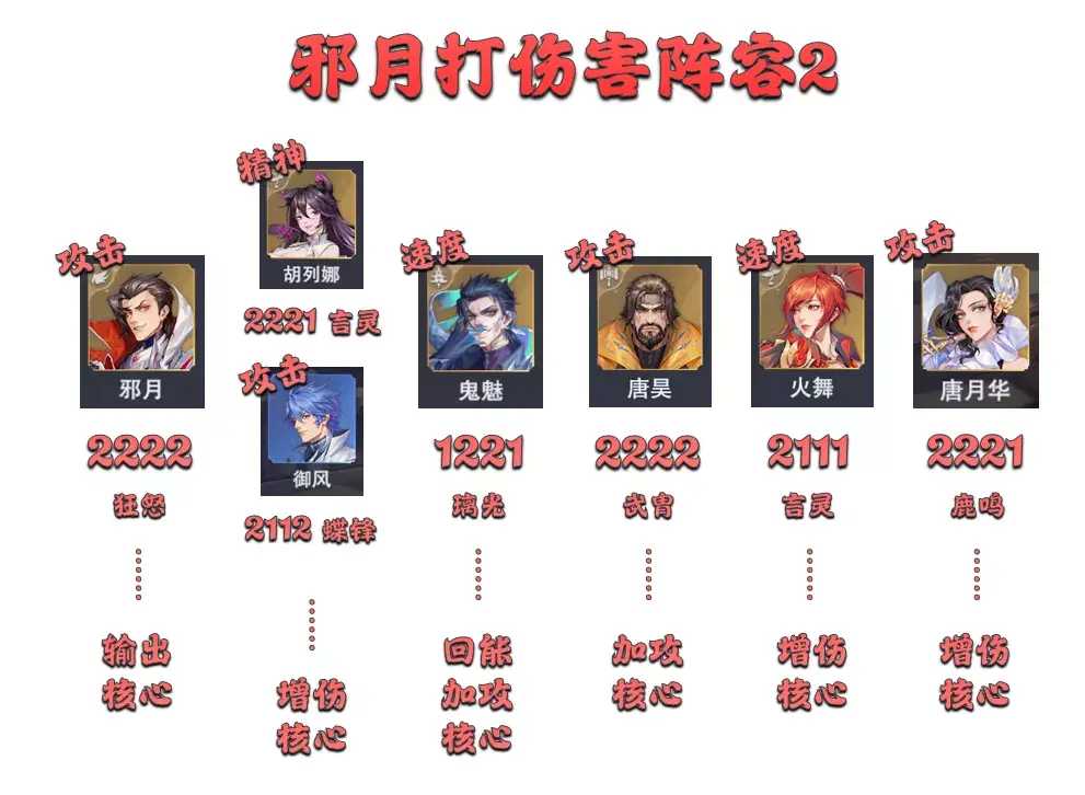 PS:阵容2的操作要点有,唐昊大概在邪月24层【月刃】时给到邪月【昊天之心】的加攻效果;唐月华注意在【惊弦】和普攻间切换即可,辅助站不住的时候可以使用1技能【余音】;鬼魅或火舞保持4技能即可;御风在1技能和普攻间切换即可;胡列娜保证对手有【重伤】状态的情况下可用4技能施加【混乱】状态;