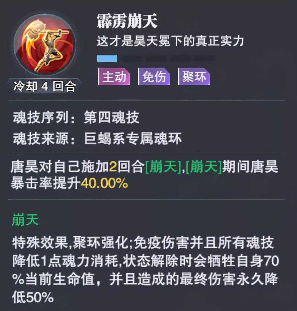 其二则是随着唐月华上线后而新被开发出来的阵容,这套阵容较原阵容是去掉了宁风致与黄远,取而代之的则是唐昊+唐月华的双唐组合,这个组合首先要求你的唐昊攻击力要高,练度要高,因为一位练度不高攻击不高的唐昊在这里杵着其实是不能为邪月提升多少攻击辅助的,当然唐昊的2技能【昊天意志】的加攻效果想必大家都是清楚的,如何触发之前维一也是讲过很多次了(例如其中一个方法是带【狂猿】左臂骨开局减20%生命,然后唐昊第1回合使用4技能【霹雳崩天】,接着平a2回合即可触发2技能【昊天之心】的加攻效果),大家可以多多参考一下;其次唐月华的加入可以有效的利用2技能【礼乐】来提升邪月的攻击力(最高提升唐月华135%的攻击力)和暴击率,保证邪月一直都处在满暴击的状态,当然唐月华本身的练度和攻击越高,邪月所加的攻击力也会越高,其次唐月华的3技能【碎玉】还能给对方增伤,并且4技能【惊弦】还拥有破格使用魂技与提升暴伤的作用,这也是为何她能取代黄远的原因之一。