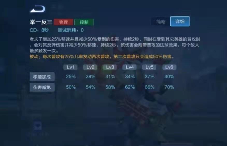 老夫子增加25%移速并减少50%受到的伤害,持续2秒,同时在受到其他英雄的普攻时,会反弹其伤害并减少50%移速,持续2秒。该伤害会附带普攻的法球效果,每个敌人最多触发一次。