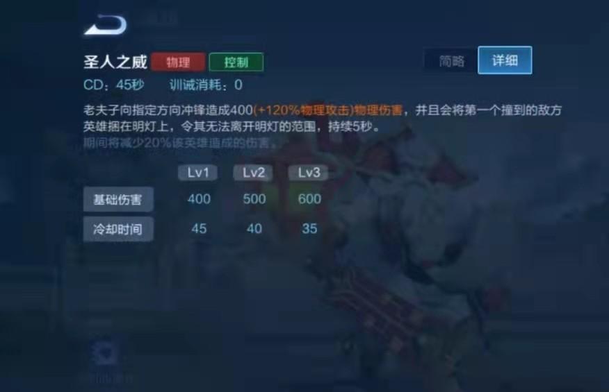 老夫子向指定方向冲锋造成400(+120%物理攻击)物理伤害,并且会将第一个撞的敌方英雄捆在明灯上,令其无法离开明灯的范围,持续5秒。