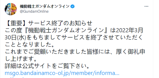 今天《机动战士高达OL》官方宣布游戏(日服)将于2022年3月30日停服。官方在公文中称“虽然自开服以来,举行了各种的活动,更新和平衡性调整,但是考虑到环境的变化和未来的发展,我们决定停止对游戏的服务。”