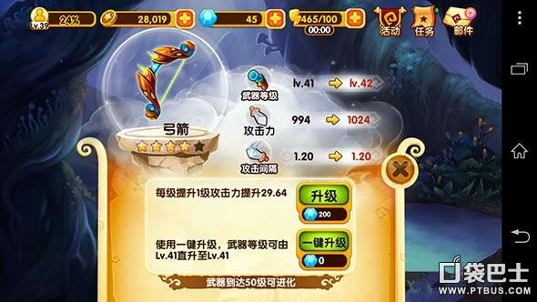 弓箭30级升级4星后就可以不用升级了。30级时面板攻击在750左右,花费2000钻石升到40级面板攻击970,打怪时750和970造成的伤害是800多和1000,差距不大所以不推荐升高级。