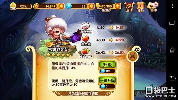 角色尽量升到50级达到5星。30级升4星时会提高1000多的生命值,50级升5星时还会增加近2000的生命值。老奶奶的生命值在4星50级时是2900多5星50级则为4800。