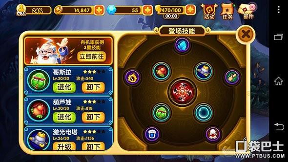 推荐携带技能组合为(葫芦娃、哥斯拉、保护罩or风火轮or灭世神雷、激光塔)如果保守点选保护罩,激进选神雷。4个技能中集中所有资源升级激光塔激光塔。