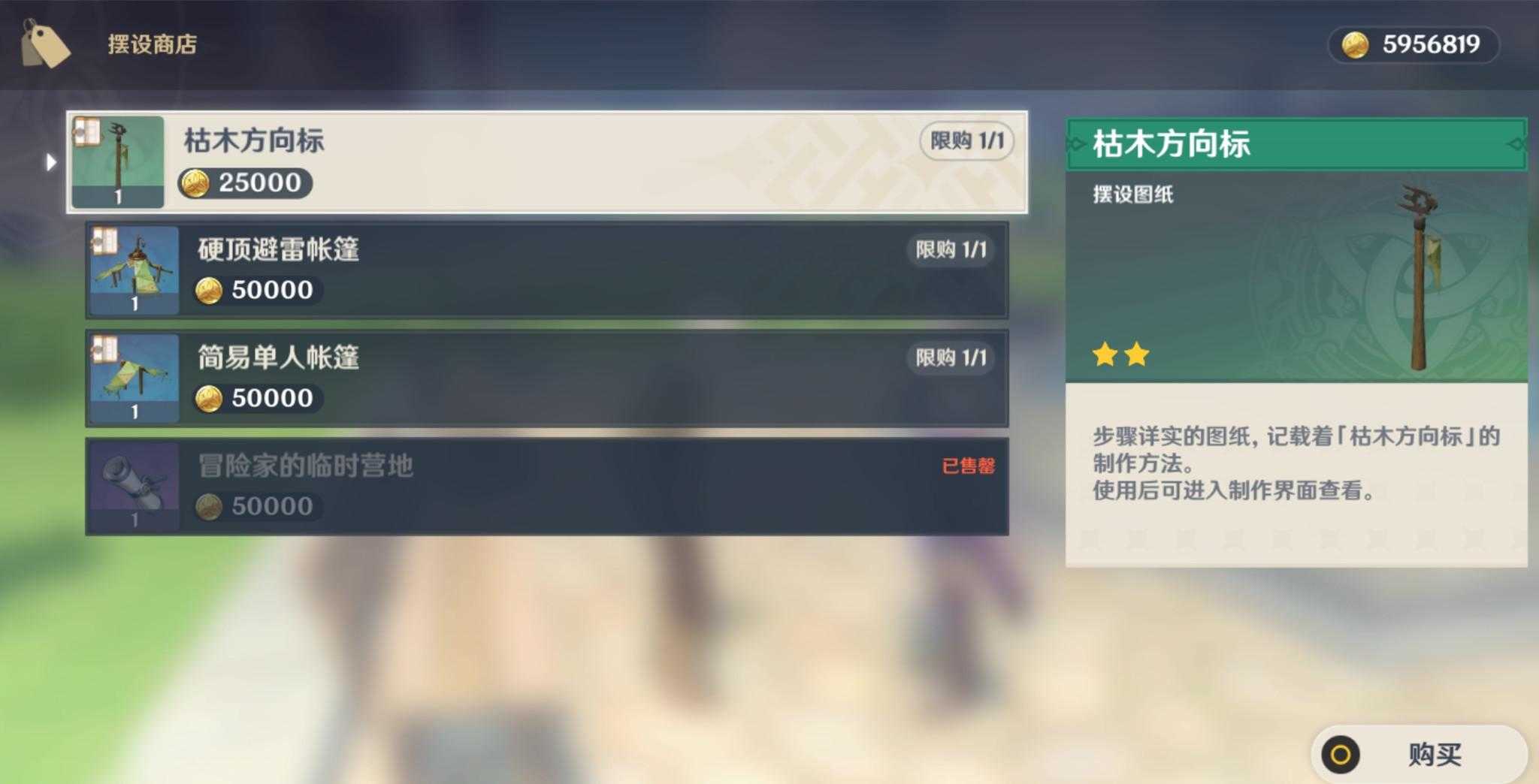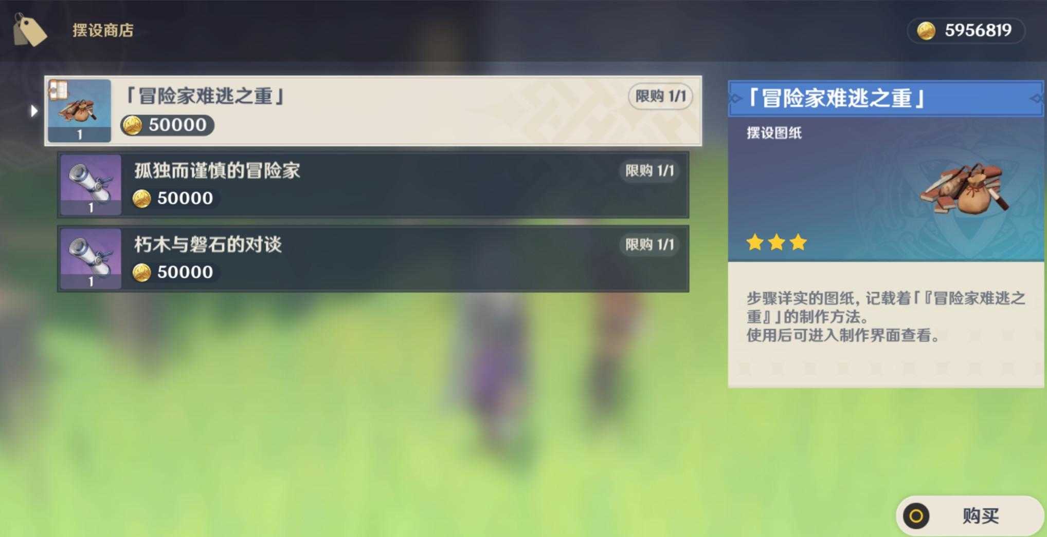 可以看到两个npc头上都有一个图标,所以一眼就能看出区别,在路爷这里可以购买到【冒险家逃难之重】、【孤独而谨慎的冒险家】、【朽木与磐石的对谈】三个摆设图纸,全收购的话需要15万摩拉。