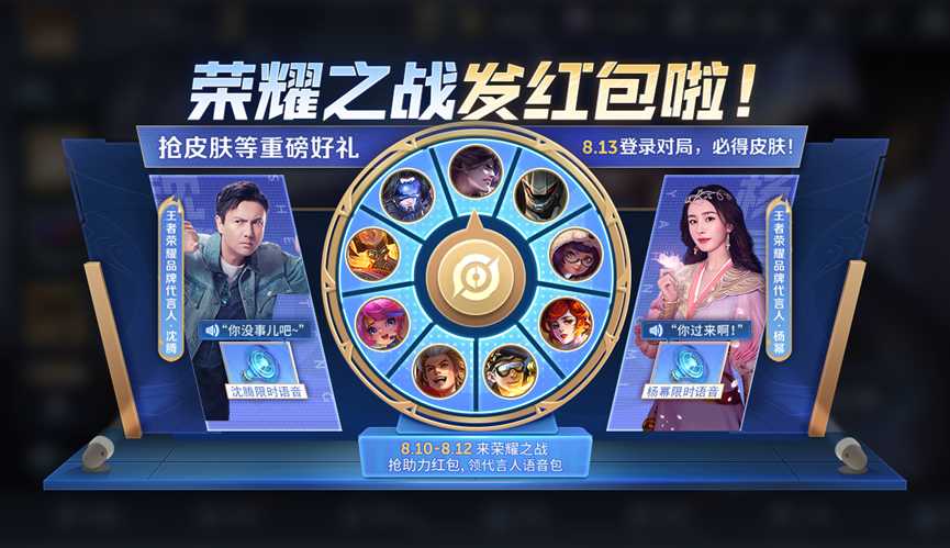 荣耀之战将在8月13日正式开启,当天参与实战可获得100荣耀值,直接随机领取一款永久皮肤,皮肤奖励如下图:有1%的概率可以获得史诗皮肤,99%的概率获得勇者皮肤或伴生皮肤,如果全有了则是回城特效礼包。