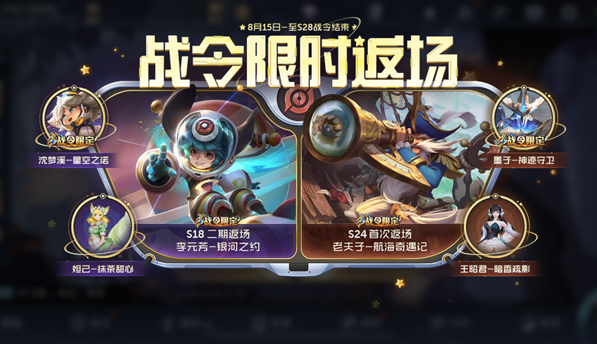S18战令皮肤和S24战令皮肤将在8月15日抽奖返场,每款皮肤有0.7%的概率被抽中,80级战令皮肤(老夫子-航海奇遇记或李元芳-银河之约)累计消耗3125战令币必得,1级战令皮肤(墨子-神迹守卫或沈梦溪-星空之诺)累计消耗1275战令币必得。