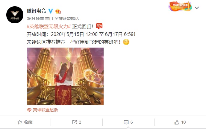 IT之家5月13日消息 根据腾讯电竞的消息,英雄联盟无限火力正式回归,开放时间为2020年5月15日 12:00 至 6月17日 6:59。