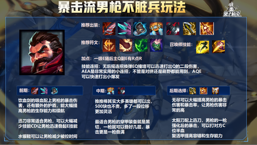 出装方面:饮血剑的生命偷取加上男枪的暴击伤害有很好的回血效果,并且还有一个额外的护盾,可以刷完野带着一层护盾去和对方打架。迅刀是目前比较强势也是男枪出的最多的装备,可以让男枪快速的叠起E技能,高额的护甲让男枪非常肉。鞋子可以根据局势来选择是水银鞋还是铁板靴,控制多或者法伤多就水银鞋,物伤多就铁板靴。附魔推推棒是一个很好的选择,推推棒多一段位移,并且价格非常便宜,可以让男枪更加灵活。黑切是最适合男枪的核心装备之一,男枪不暴击的情况下两枪可以叠满黑切,暴击的话一枪就可以叠满黑切,让男枪拥有高额的破甲。无尽大幅提高男枪的暴击率和暴击效果,让男枪不管是回血还是打伤害都非常的夸张,后续可以补出太阳刀,打C位真就是两枪拿下了。