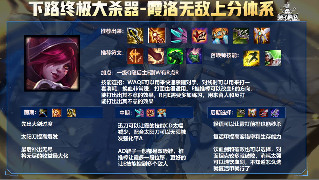 大家好,我是兔子攻略组的大马猴。最近男枪反应比较强烈,所以我去试了一下目前男枪的强度,虽然男枪的刷野速度并不是最快的,但是男枪的刷野是无伤的。利用好这一点在野区也是很强势的,可以速三反野或者速三抓人,一个节奏好的男枪给对手的野区和线上压制力都特别强。Q=1技能,W=2技能,E=3技能,R=4技能