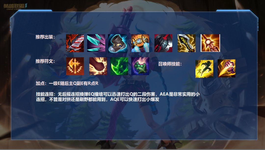 换弹EQ撞墙可以迅速打出Q的二段伤害,AEA是非常实用的小连招,不管是对拼还是刷野都能用到,AQE可以快速打出小爆发,EW可以远距离扔出烟雾弹减速敌人。