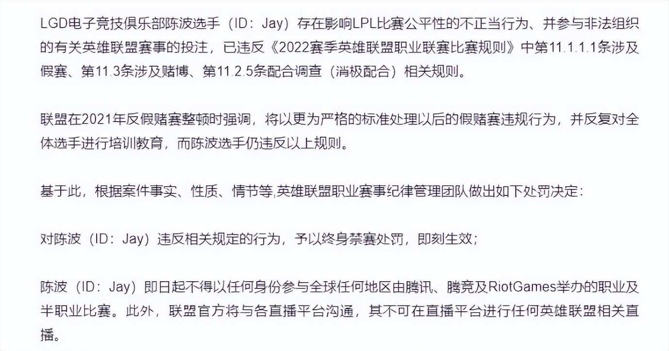 这次等待jay的惩罚会是什么呢?因为假赛问题频繁发生,这次官方决定加大处罚力度,直接终身禁赛,这次LGD先出来发公告了,首先证实了jay打假赛的事实,最后来了一句:俱乐部决定对陈波做出开除处理,并保留追究法律责任的权利。