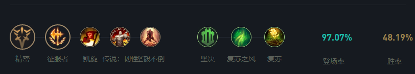 征服者可以让剑魔在对拼的时候得到攻击力加成与治疗效果;凯旋可以在对拼或者参与击杀之后得到一个回复,不至于丝血死掉;韧性可以增加剑魔坦度;坚毅不倒则是可以让剑魔在丝血的时候砍出更多的伤害与回复。