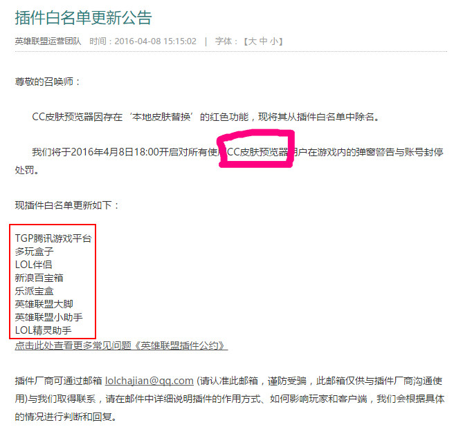 包括TGP、多玩盒子以及新浪百宝箱在内,一共8款插件被列入了白名单,这也就意味着大家可以放心大胆的使用这些第三方插件,毕竟是官方审核通过的。可在这份公告里,我们也发现,一款名为《CC皮肤预览器》的插件被提及,并且官方还称,如果将从今天18.00开始,对此前使用过这款插件的玩家予以弹窗警告甚至封停账号的处罚,那么这款名为CC皮肤预览器的插件究竟是什么鬼呢?
