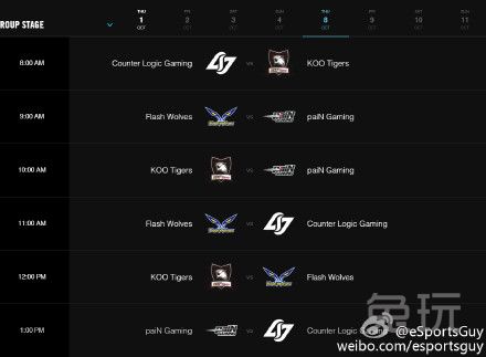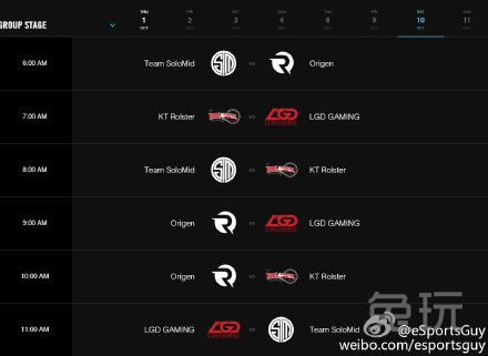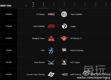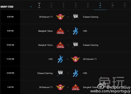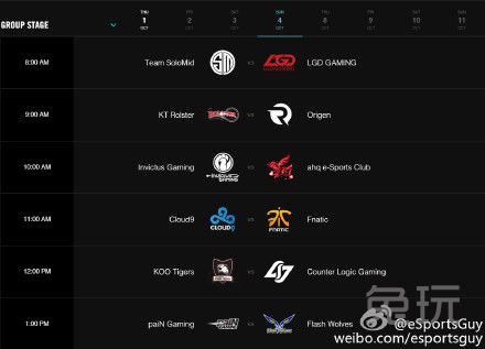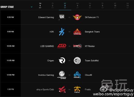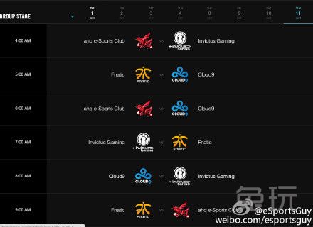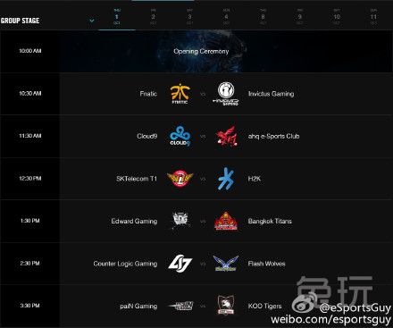 官方放出世界赛小组赛日程。图中为八个比赛日具体时间(图中为美国东部时间,国内只需将AM看成PM即可)。小组赛预计于国内10月1日晚上十点开始开幕式。揭幕战将由Fnatic对阵IG。